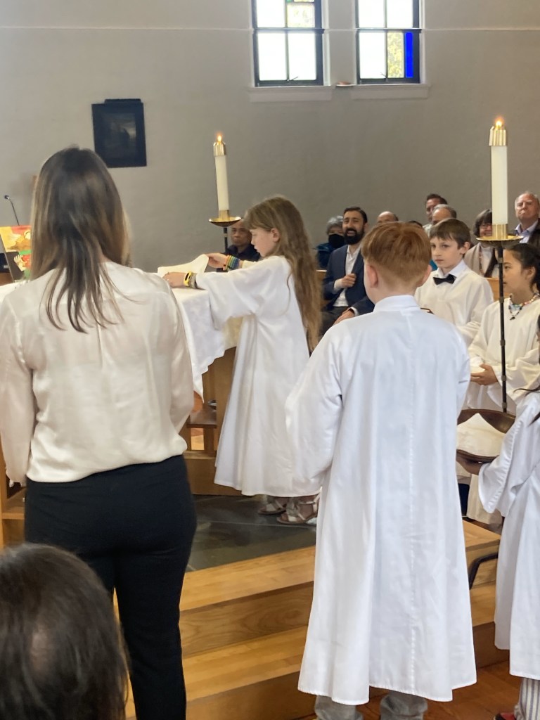 A group of many ages and diverse ethnicities, our focus was on the children. All wore simple, identical white albs, so none of the emphasis on clothing that had shadowed too many of these celebrations. To them we were entrusting one of our finest treasures, and they had been well prepared. The day before, they learned to handle the chalice reverently and not make funny faces for their first sip of wine. They decorated a candle and lit it from the Paschal candle, then their parents told the children how they brought the light of Christ into their homes.